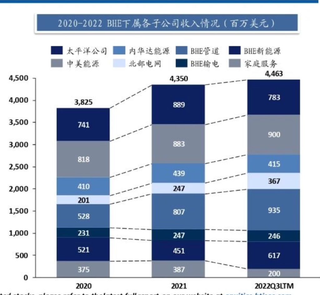 巴菲特在2022年给股东的信上说:“BHE已成为美国大部分地区的公用事业发电厂和风能、太阳能和输电领域的领先力量”。巴菲特将其形容为,这是“我们最后的巨人”。