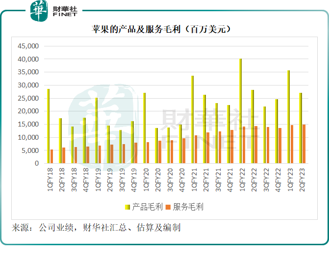 截至2023年4月1日止的12个月,苹果的产品毛利率约为35.85%,而服务业务毛利率则达到70.95%。