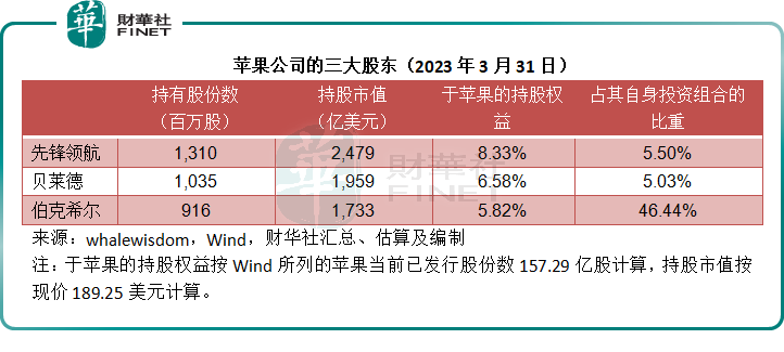 从whalewisdom提供的数据来看,苹果当前的三大股东分别为公募基金之王先锋领航、资产管理专家贝莱德和股神巴菲特的旗舰伯克希尔(BRK.A.US),其持股市值分别为2479亿美元、1959亿美元和1733亿美元,或合共占了苹果总权益的21%,见下图。