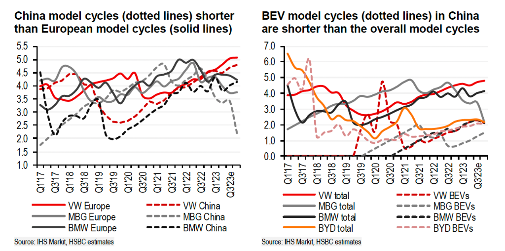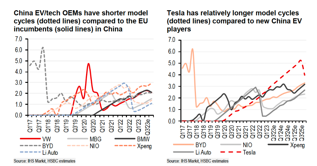 内卷到恍惚的中国汽车制造商也让汇丰在报告中发出疑问,不断缩短的车型的更新率,这个做法可持续性如何?
